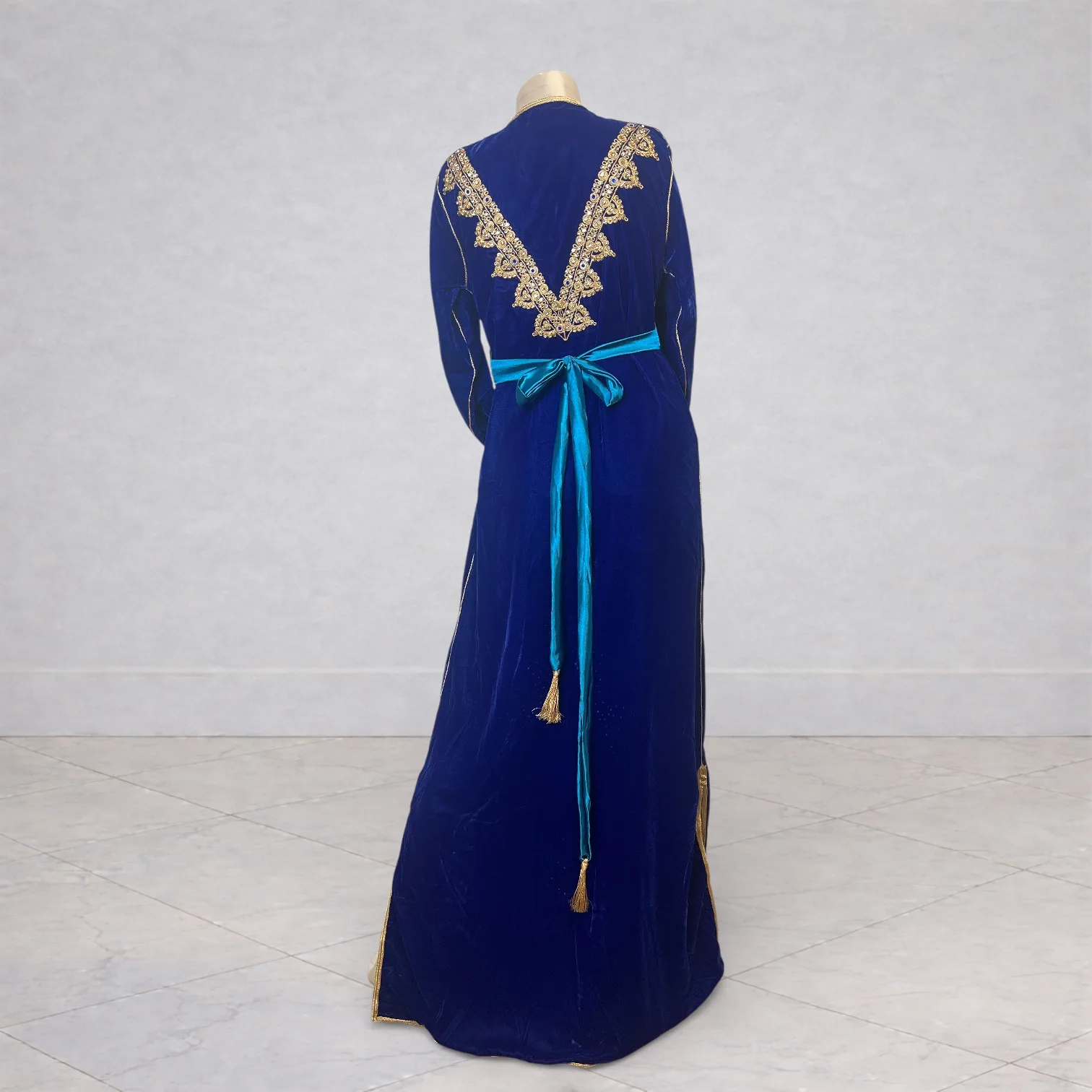 Ce caftan bleu en velours se distingue par son tissu luxueux et sa finition soignée.