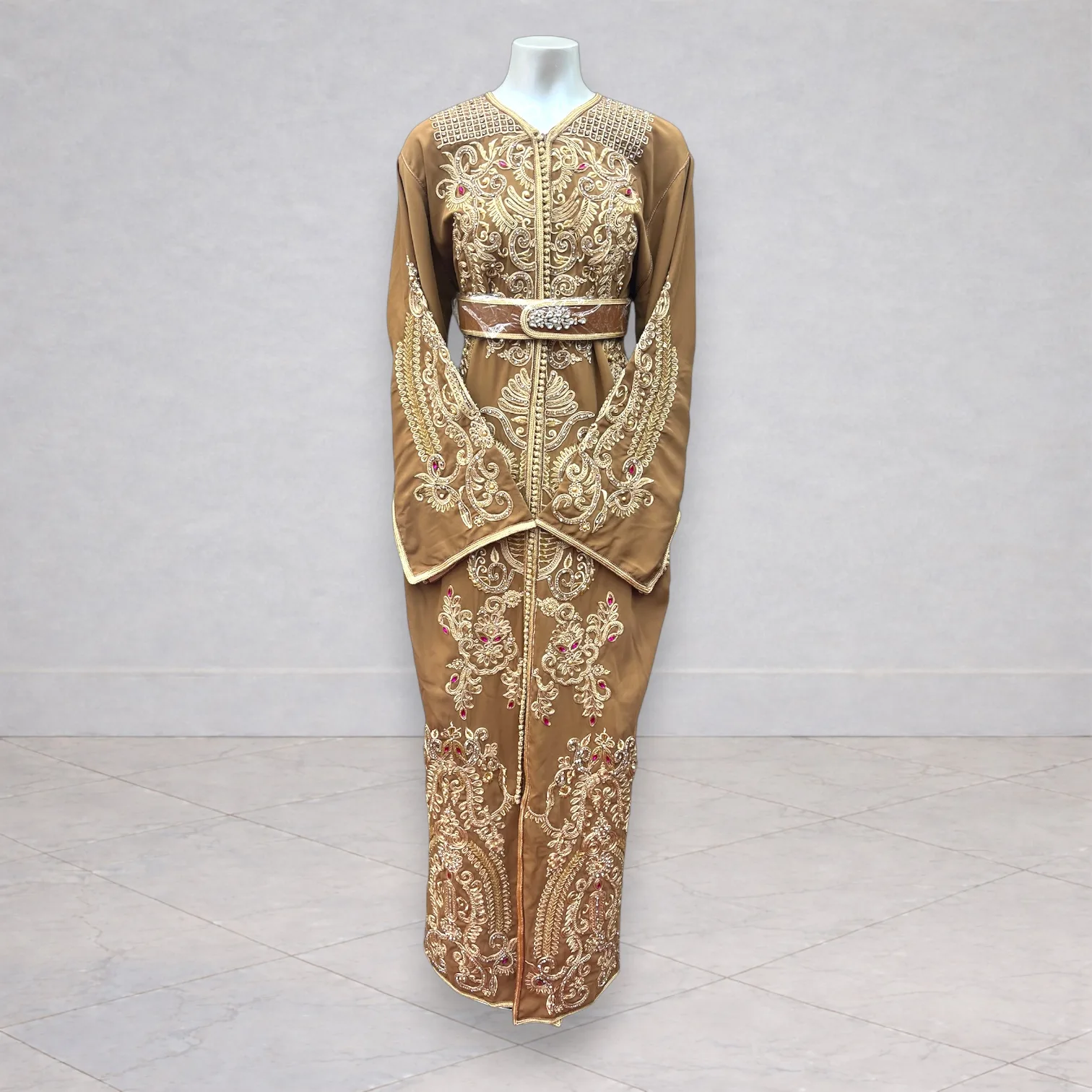 Sublime caftan marron à la coupe sirène, alliant élégance et féminité.