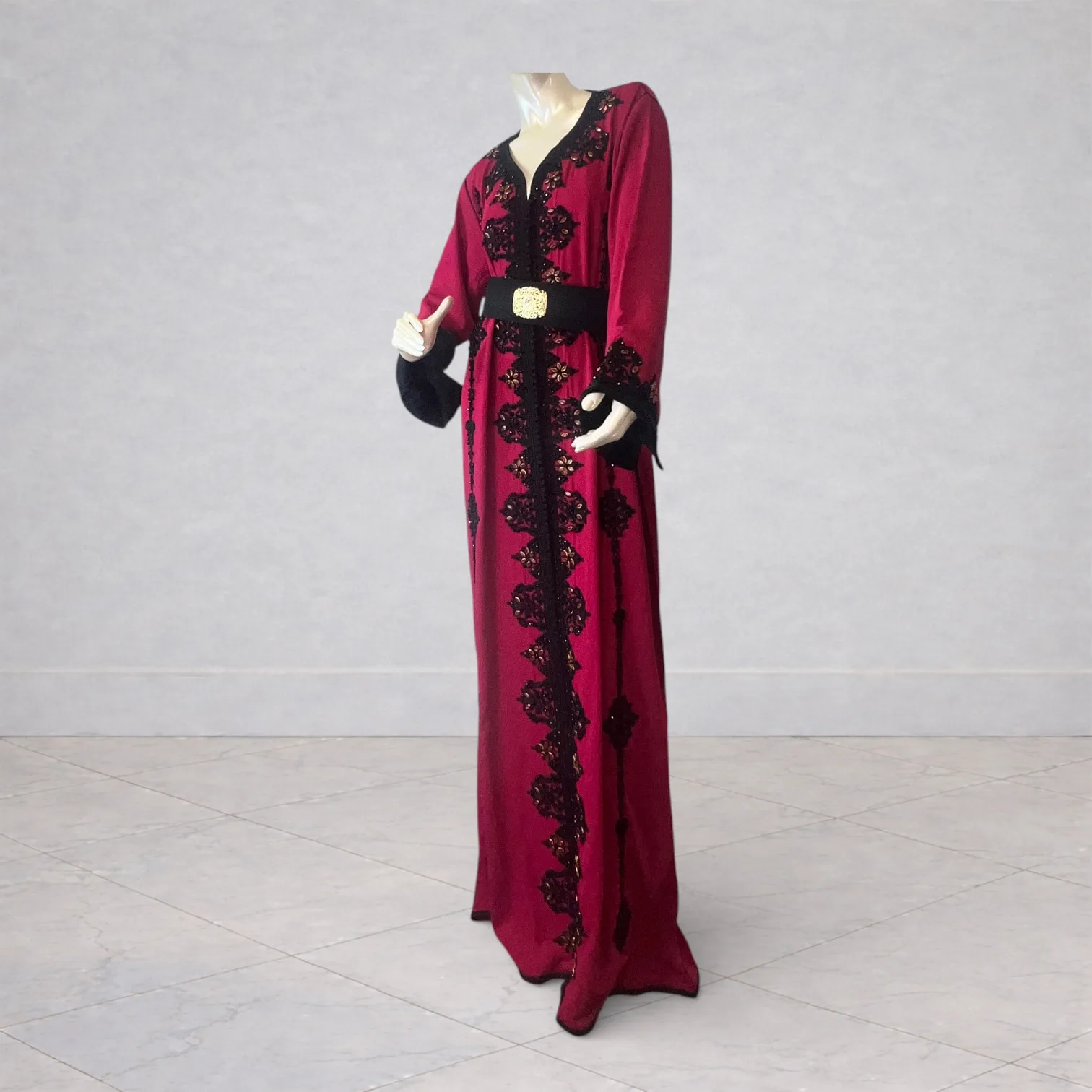 Ce caftan rouge se distingue par ses ornements noirs finement travaillés, apportant une touche de prestige et de raffinement.