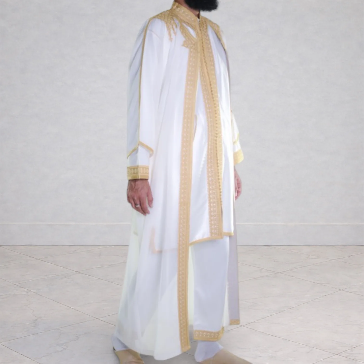 Ce jabador homme blanc et doré se distingue par son allure élégante et moderne, tout en conservant les codes traditionnels du vêtement marocain.