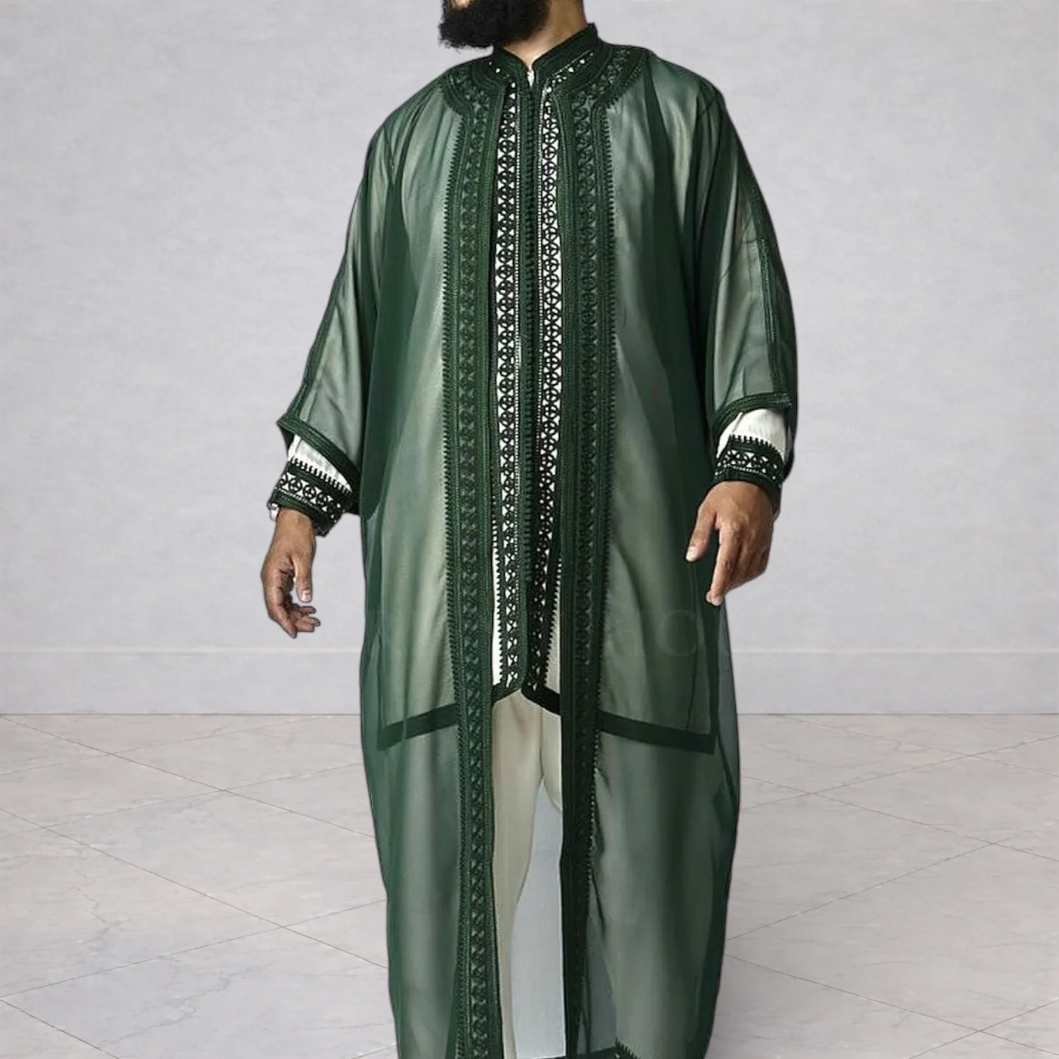 Ce jabador homme vert se distingue par son allure élégante et moderne, tout en conservant les codes traditionnels du vêtement marocain.