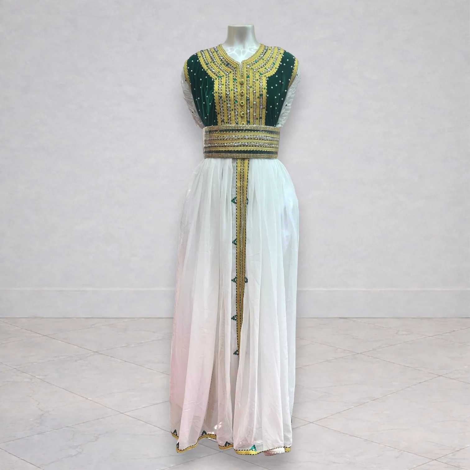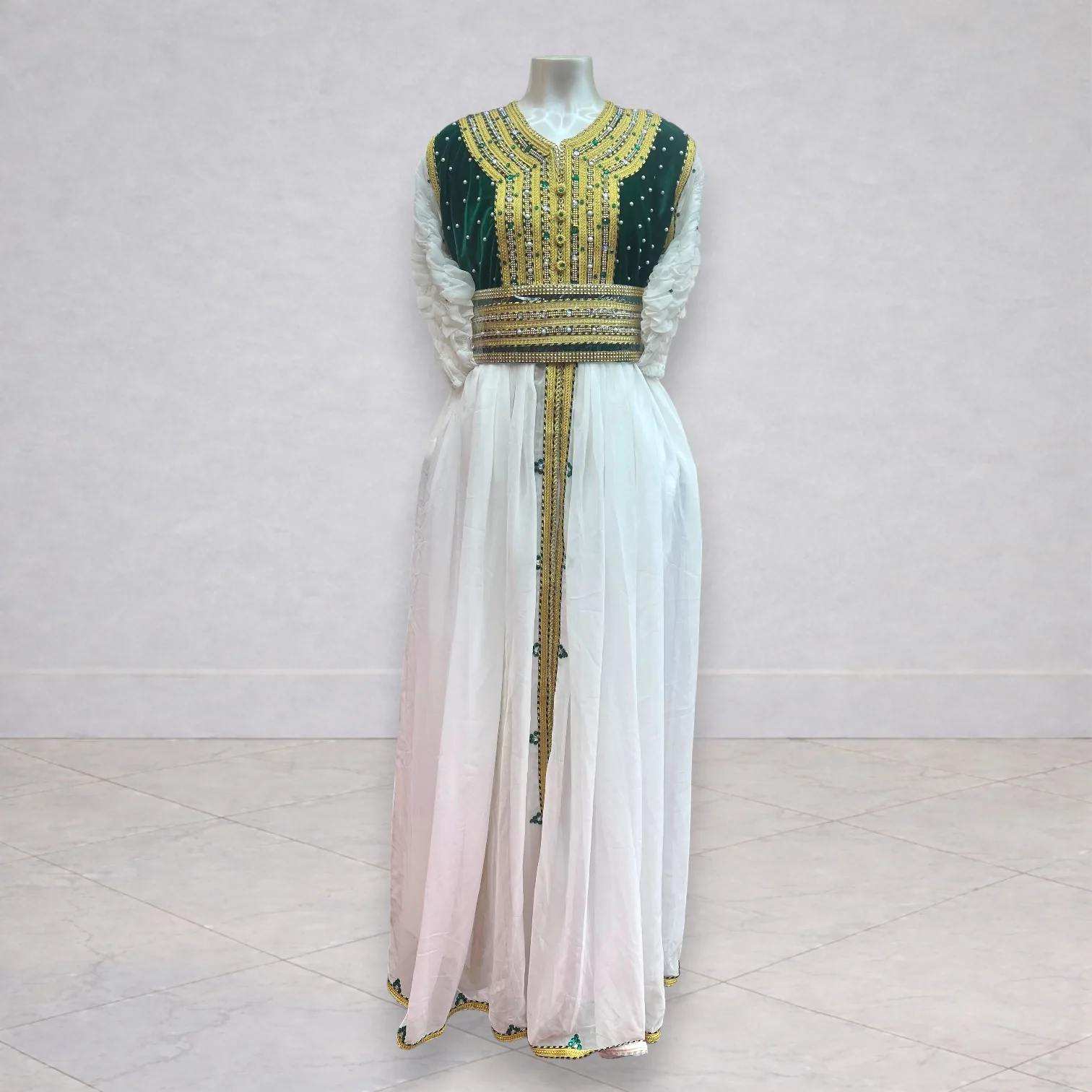 Cette robe blanche et verte se distingue par ses ornements dorés finement travaillés, mettant en valeur le contraste harmonieux entre les deux couleurs.