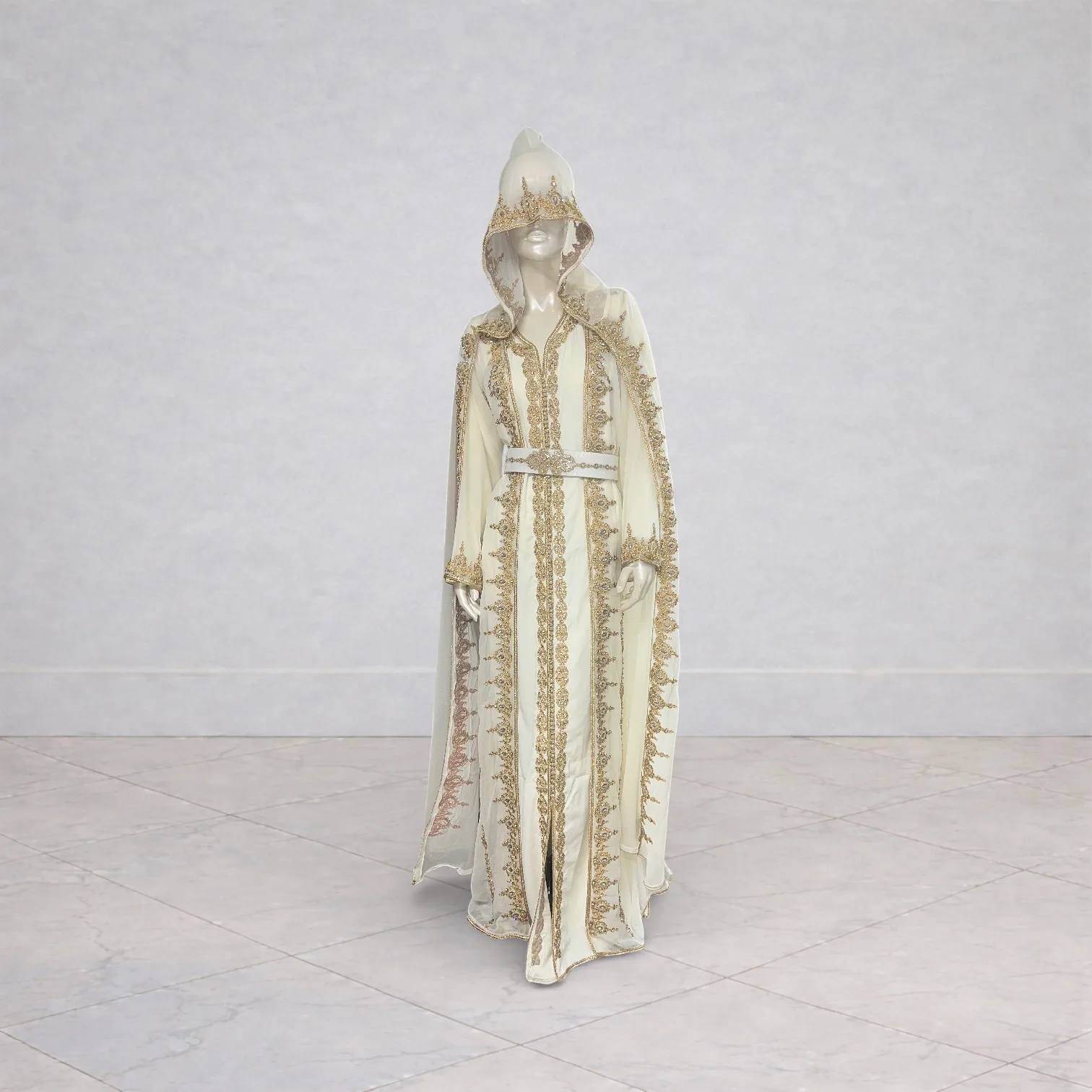 Cette takchita blanche et dorée trois pièces se compose de deux robes élégantes accompagnées d’une cape assortie, apportant une allure majestueuse et sophistiquée.