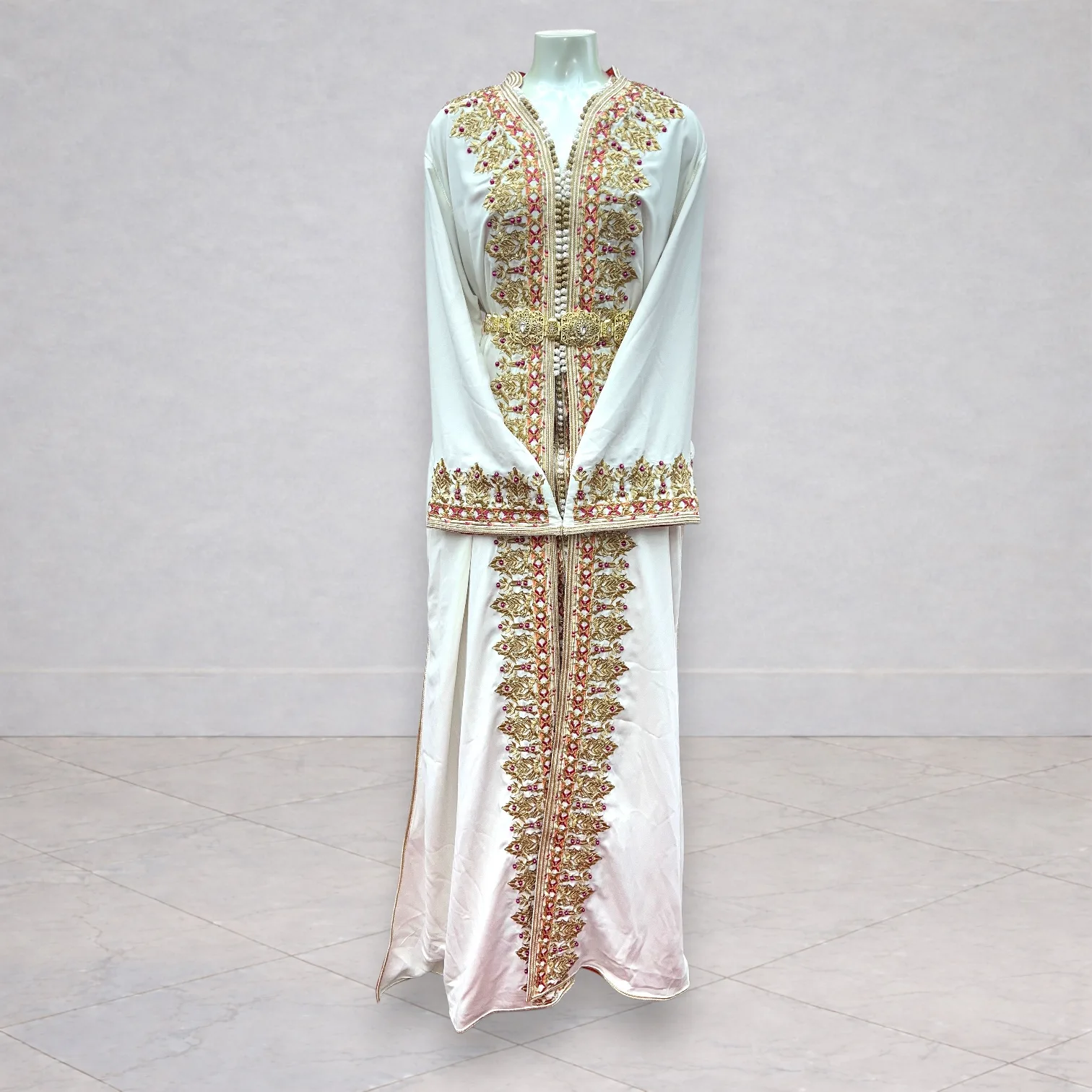 Magnifique takchita blanche ornée de broderies raffinées dorées oranges et roses, pour une allure élégante et féminine.