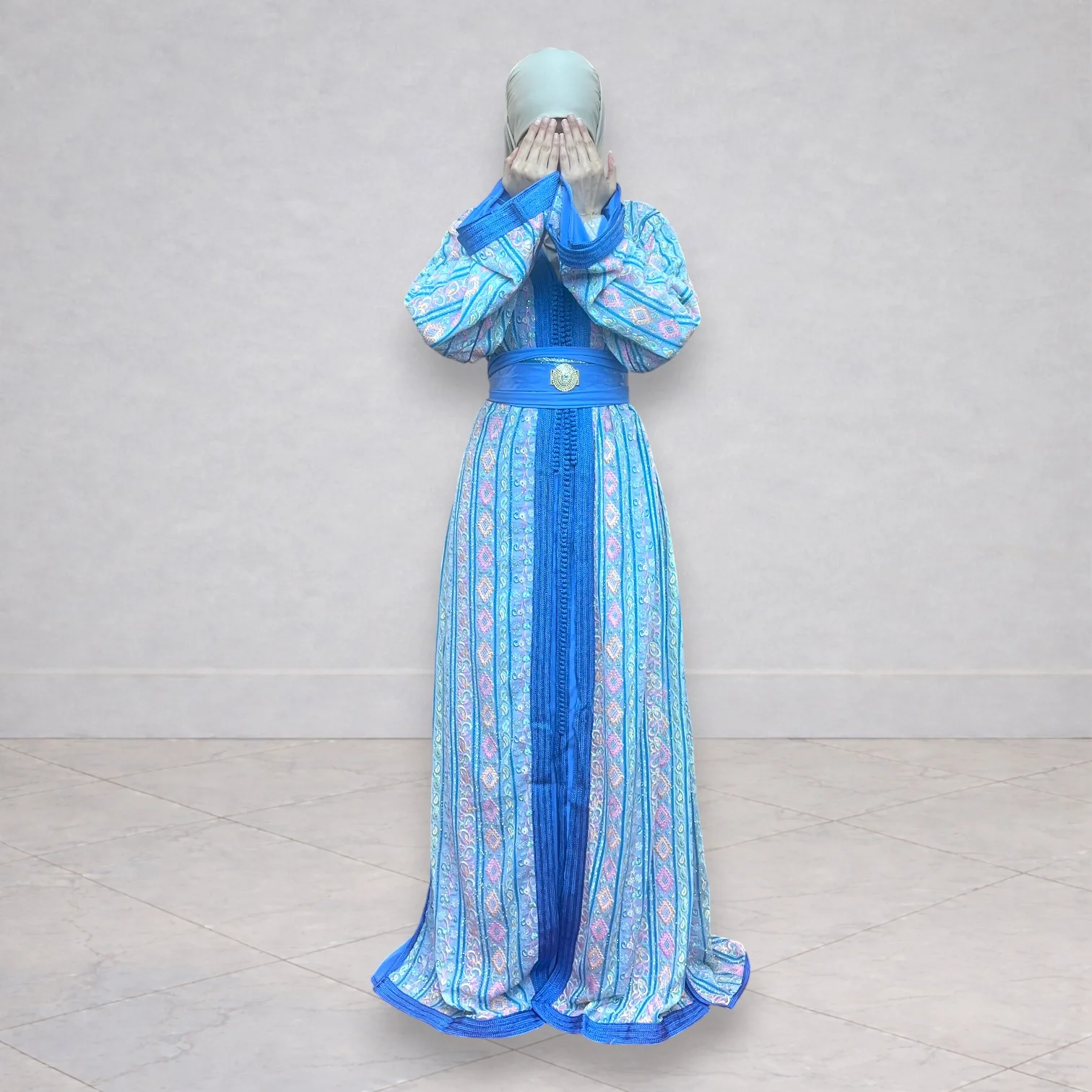 Magnifique takchita sari bleu et rose, pour une allure élégante et féminine.