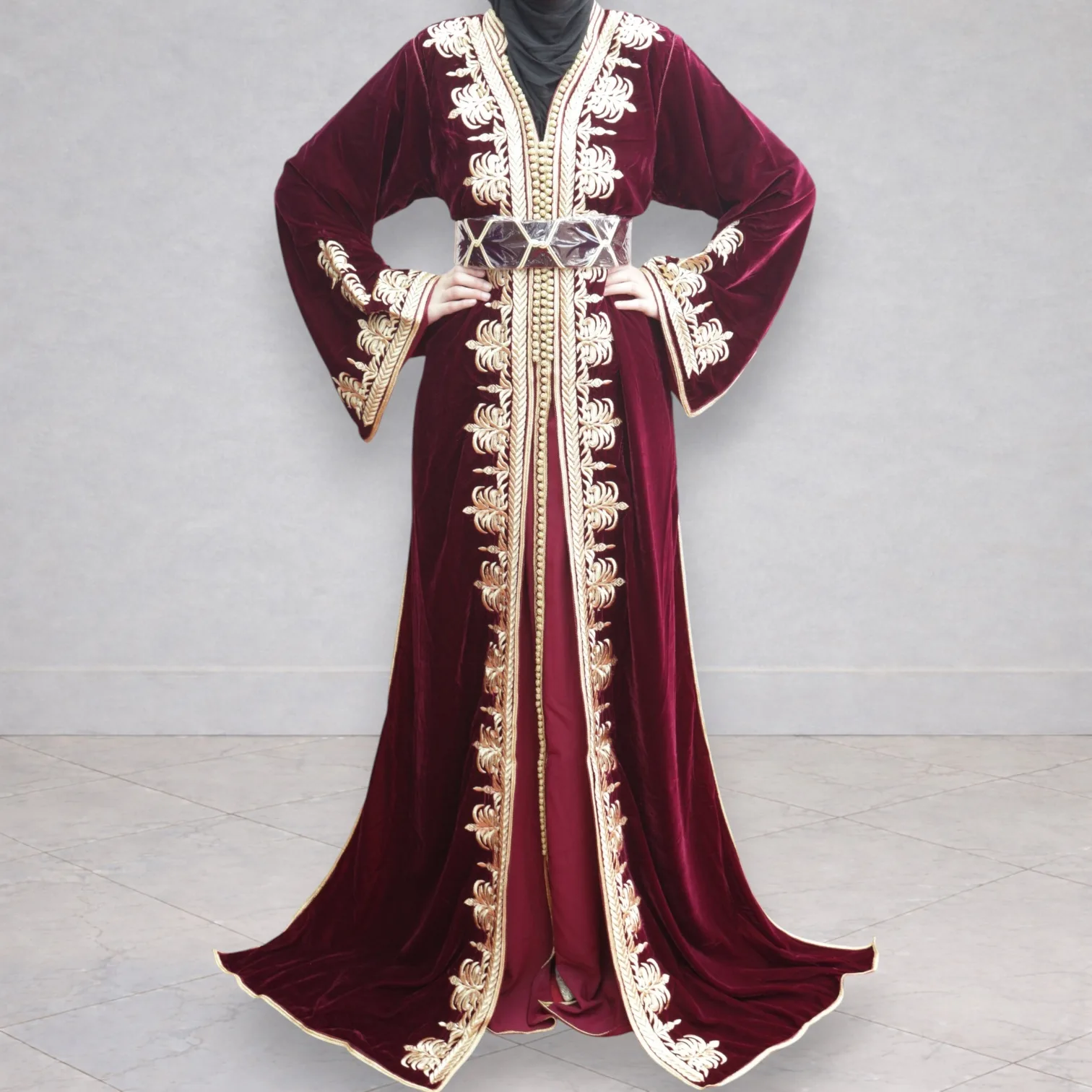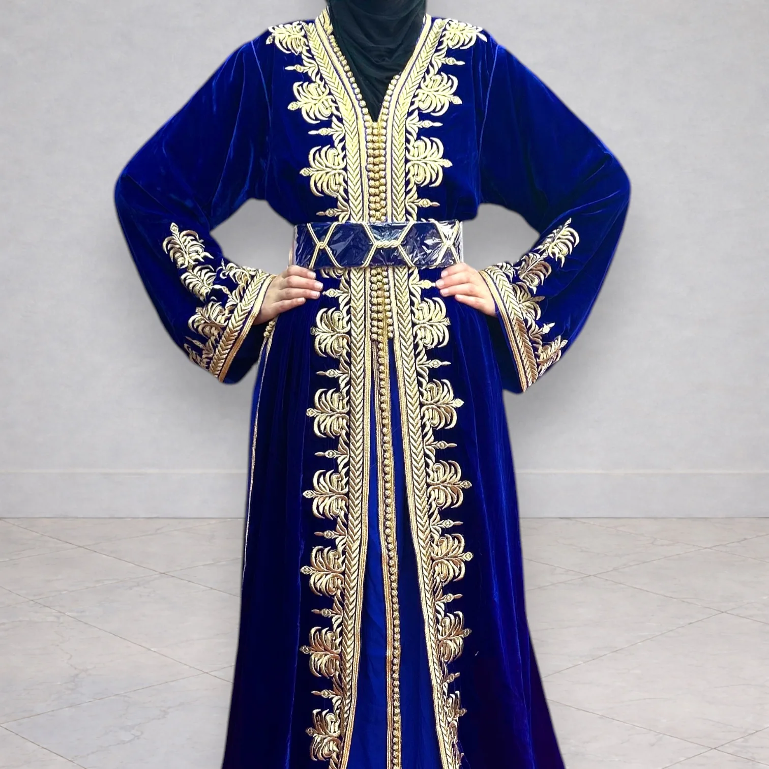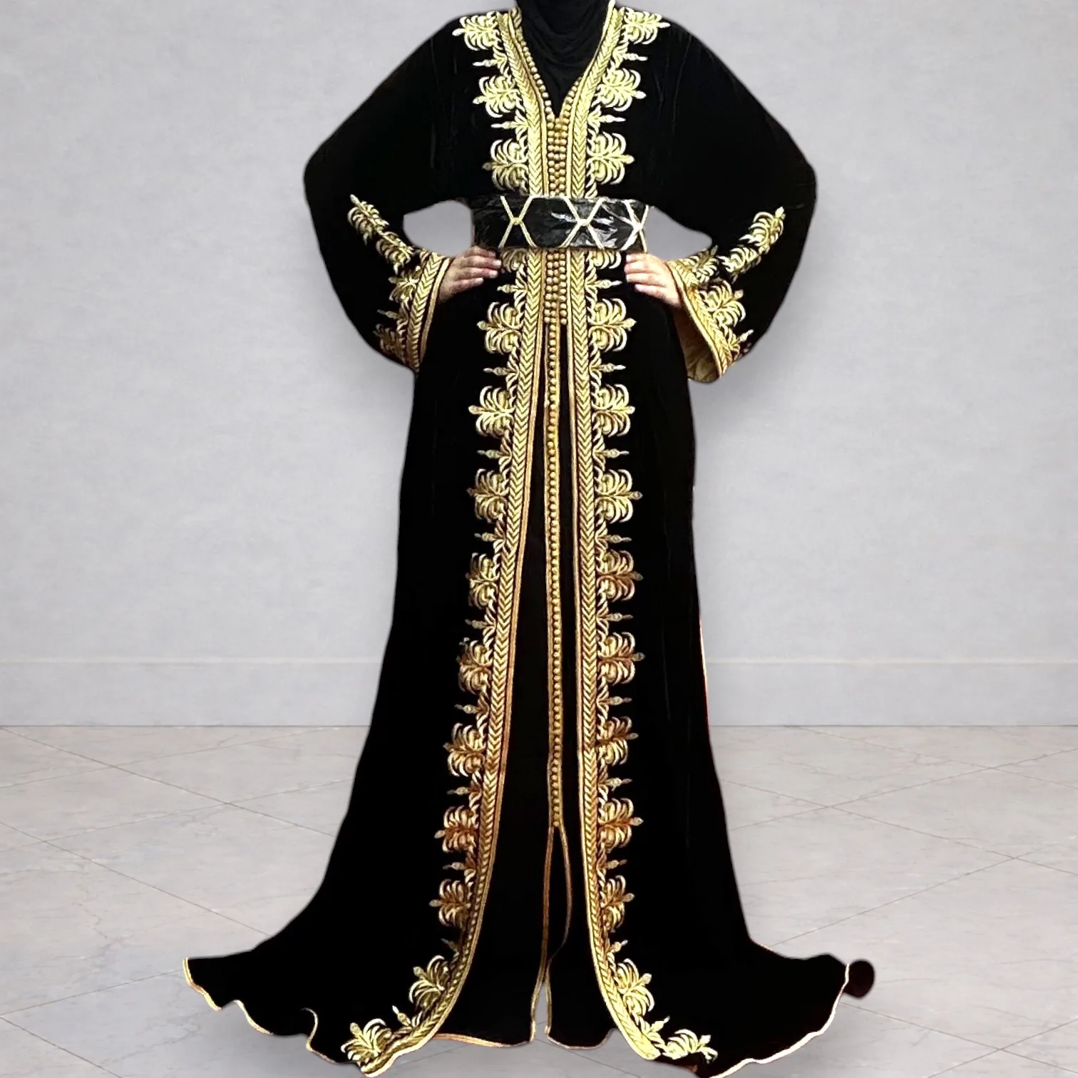 Takchita deux pièces collées en velours brodé doré.